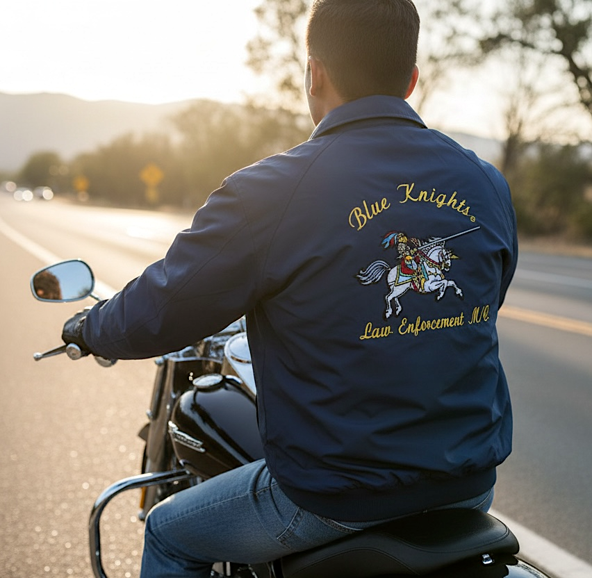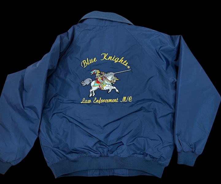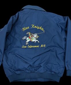 This beautiful jacket comes in royal blue and navy blue . On the front you will have the Blue Knights® logo with “Law Enforcement Motorcycle Club and on the back is the beautiful embroidery of the Knight on the white horse with beautiful colors.